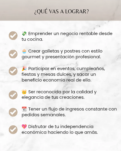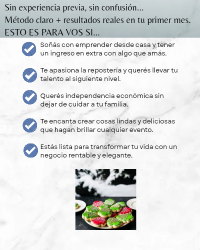 Si practicás, en 7–14 días podrás crear galletas listas para vender y en 30 días podrías tener tus primeros pedidos.